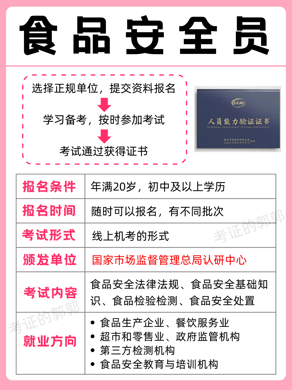 查核内容:食物平安律例、食物平安根本、食物查验检测、跟着人们对于食物平安更加留意,食物平安员做为食物行业的抢手职业,全国通用,各方面临于食物方面的办理也更加严酷,就业前景是很不错的,是正轨事业单元,将来十年城市很吃喷鼻。食物平安员证书的出证单元有国市监认研究中.心、食物工业协会等,含金量高。
